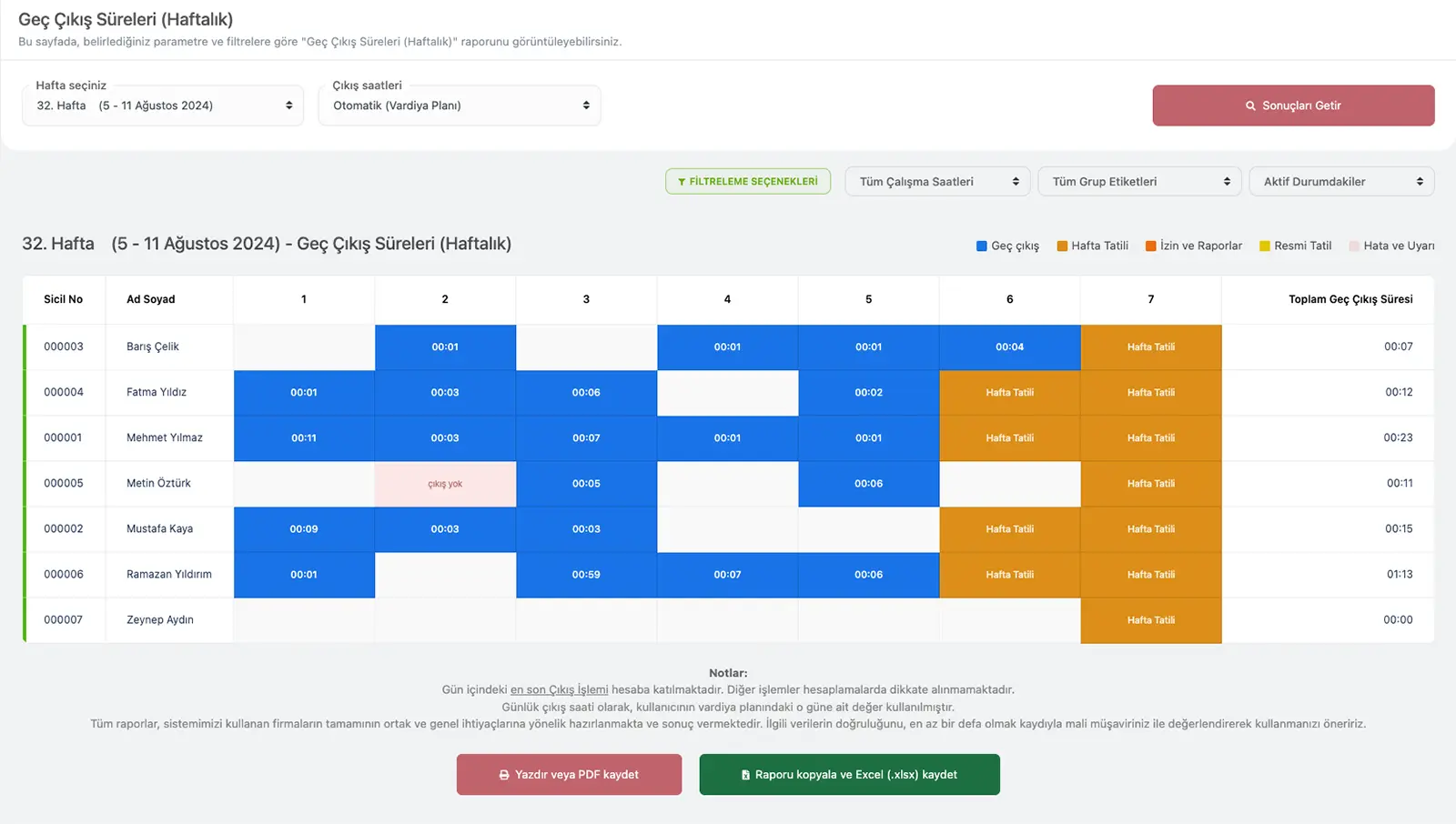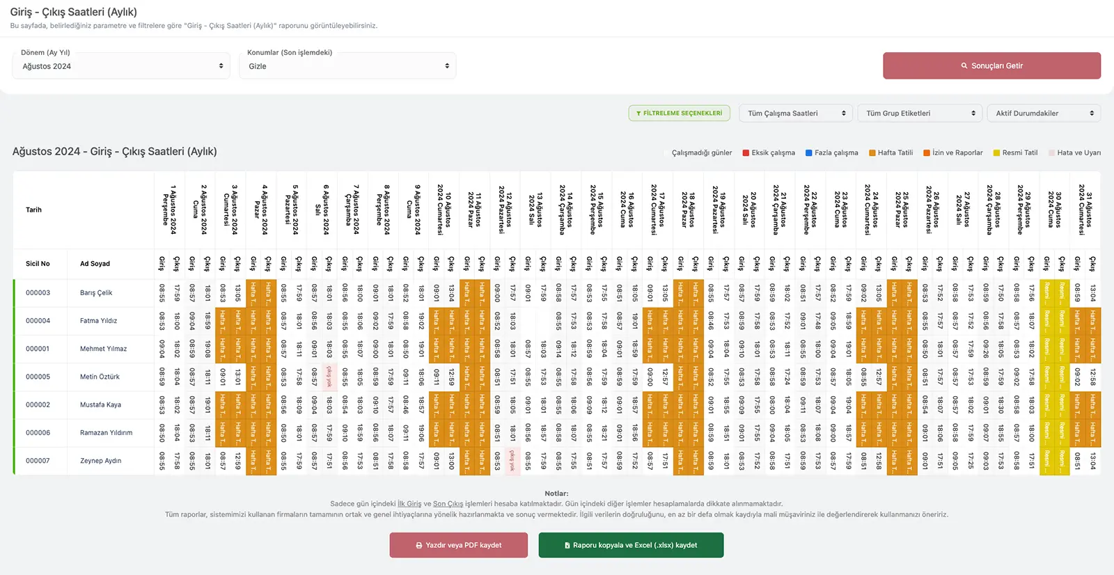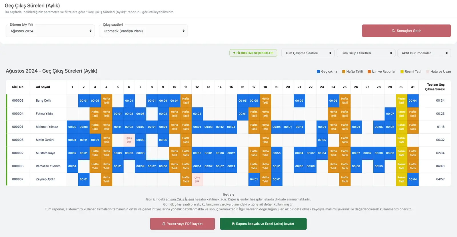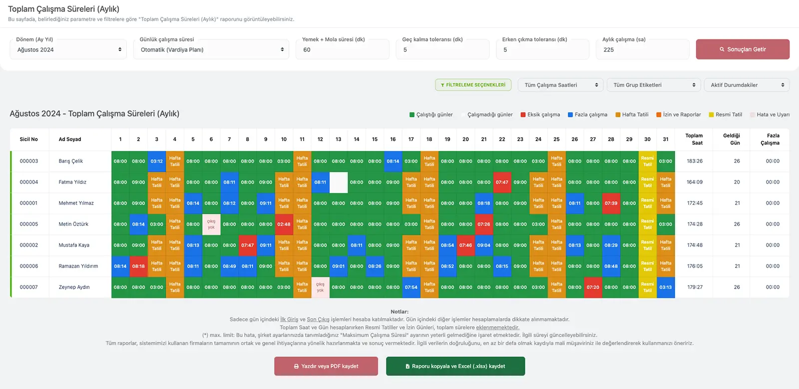 Personelinizin seçilen ayın her günü için hesaplanan çalışma sürelerini kolayca raporlayabilirsiniz.