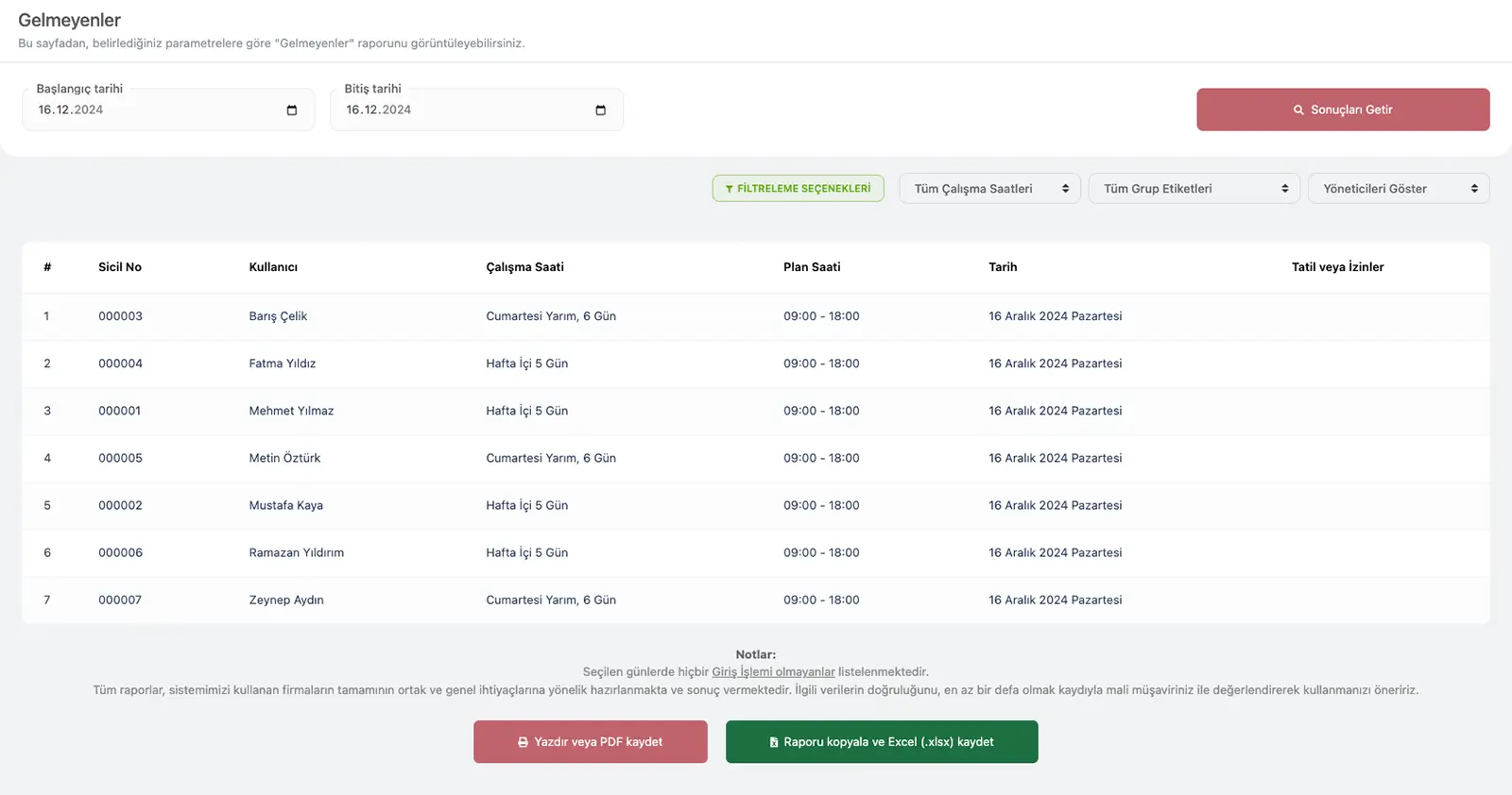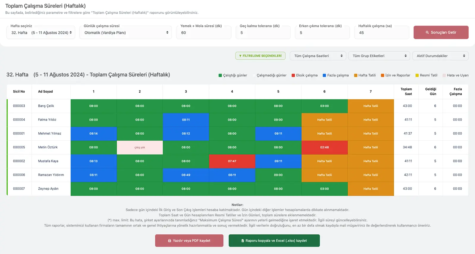 Geç kalma, erken çıkma toleransları ve günlük çalışma süresini parametreler ile belirleyebilir veya çalışma süresini otomatik almasını da sağlayabilirsiniz! Sonuçlar, Çalışma Saatine veya Şubeye göre filtrelenebilir.
