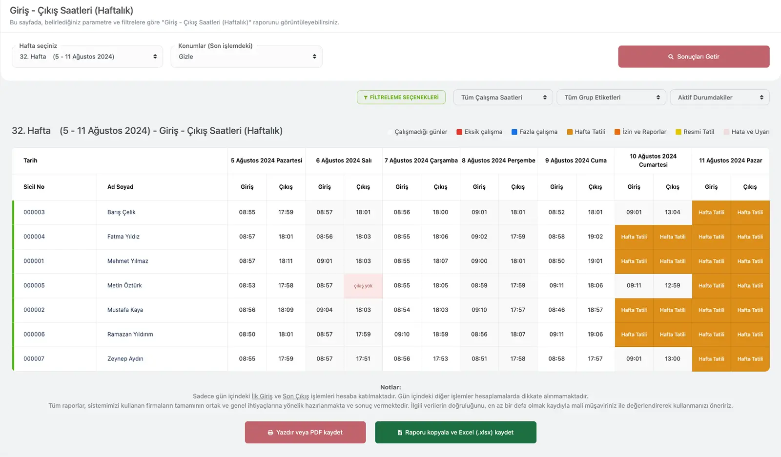 Raporunuzu tek tıklama ile PDF olarak alabilir, yazdırabilir veya kopyalayarak Excel programına aktarabilirsiniz.
