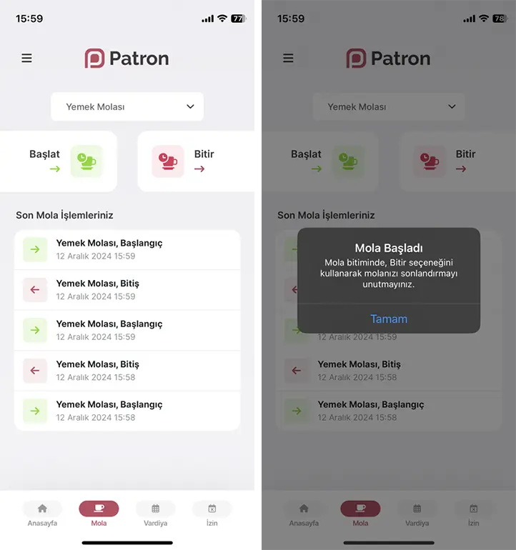 Patron PDKS, molaları mobil uygulama üzerinden kesin kayıtla alır ve otomatik süre hesaplaması yapar; bu sayede manuel süreçler yerine yasal süreçlere uygun, dijital takibi kolaylaşır.