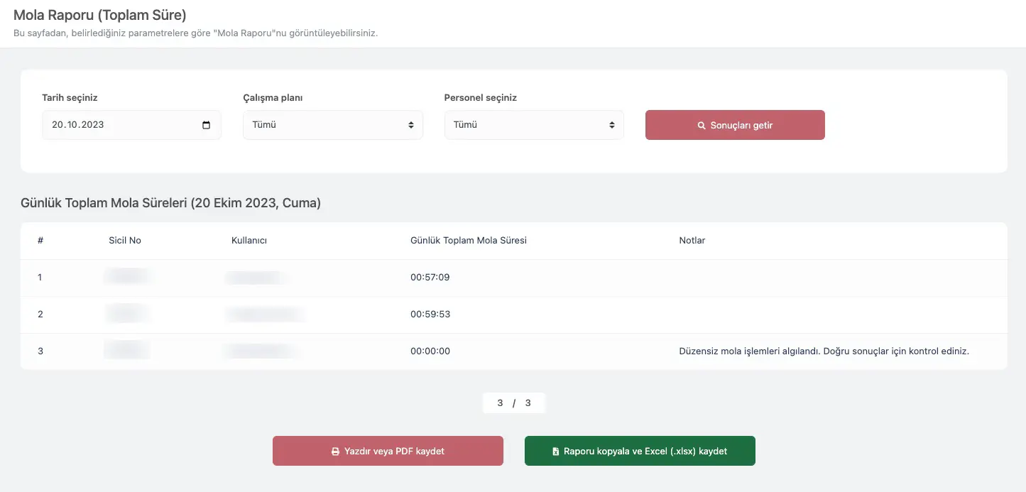Mola Raporlama sistemi ile personelin Günlük Toplam mola süresini veya günlük mola listesini kolayca oluşturabilir, Mola raporları Excel olarak indirebilir veya doğrudan yazdırabilirsiniz. Mola rapor ekranı, akıllı algoritması ile, personelin düzensiz işlemlerini algılar ve sizi incelemeniz için uyarır.