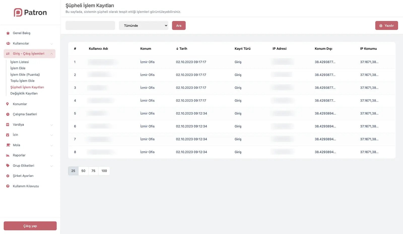 "Sahte konum" (Mock Location) algılayıcı yazılım önlemi ile, sahte konum ile işlem yapmak isteyen kötü niyetli çalışanlarınızın işlemleri tespit edilir ve şüpheli işlem olarak not edilir. Yöneticiler bu denemeleri görüntüleyebilir.